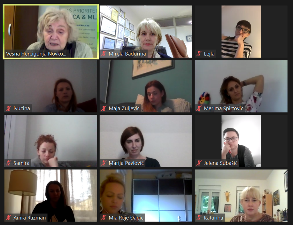 Students of the fourth year of the educational program in the field of integrative psychotherapy for children and adolescents continued to strengthen their knowledge and skills in recognition and adequate interventions. Module on the topic: Internalized disorders in children (anxiety, depressive states, suicidality and psychosomatics) was held from 5th – 7th June, 2020, under the leadership of the esteemed Prof. Dubravka Kocijan Hercigonja,PhD-MD, child and adolescent neuropsychiatrist and integrative psychotherapist. Although the module was held through the Zoom platform BHIDAPAe, it was possible to cover the dynamics of the module with all its elements from group processes, theory, work in small and large groups, to the final exam. Students had the opportunity to research and question their knowledge and skills acquired so far through enabled work on case studies.