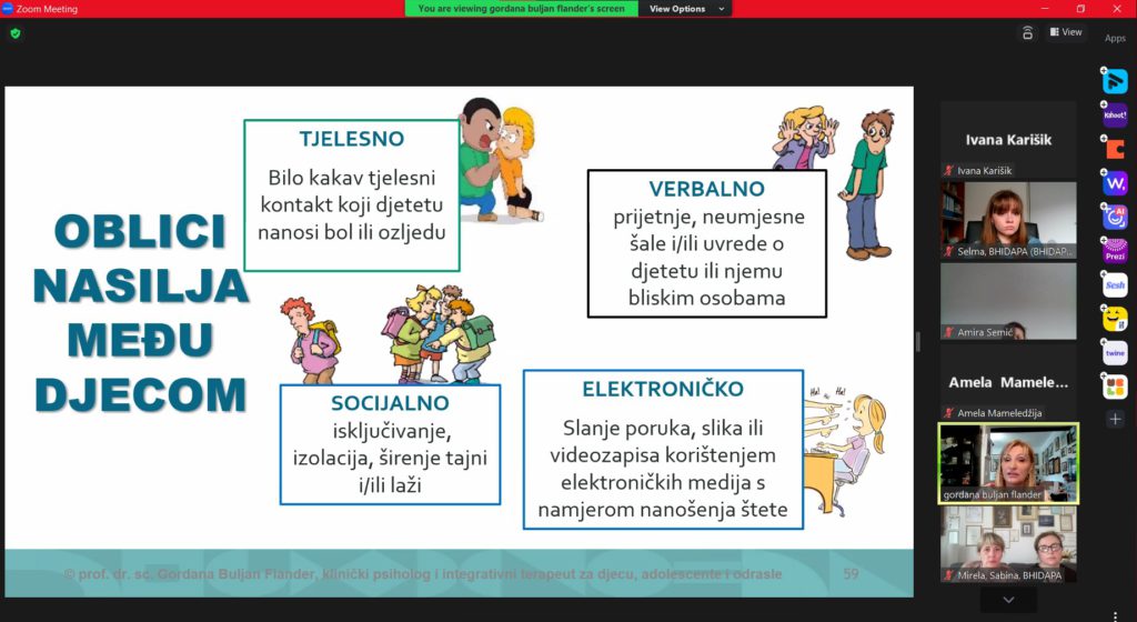 BHIDAPA, in cooperation with UNICEF and with the consent of relevant ministries, continues with specific virtual education-trainings. After successfully completing three cycles of education “Interdisciplinary network of experts “Here&Now”, and two cycles of specialized training “Interdisciplinary network of experts “Here&Now”: Care About Adolescent Girls, we continue to develop and strengthen the established network of experts with the aim of raising awareness about violence, risks and interventions through theoretical, experiential, supervisory modules and focus groups.
