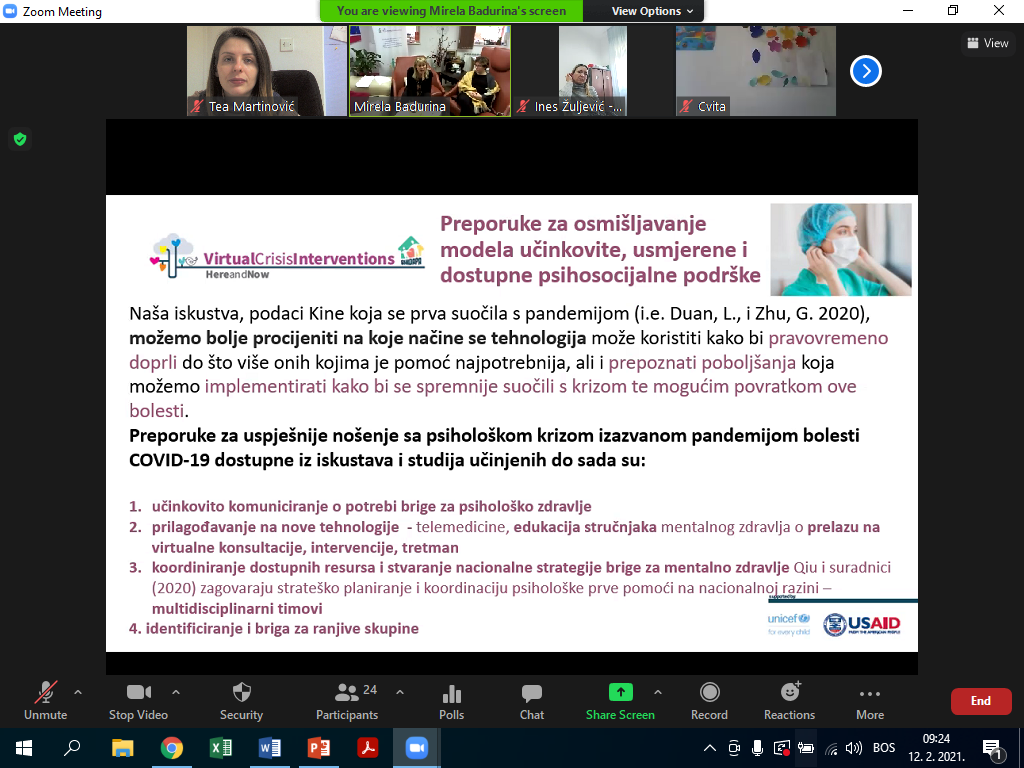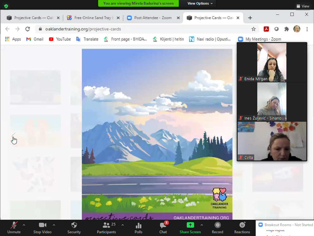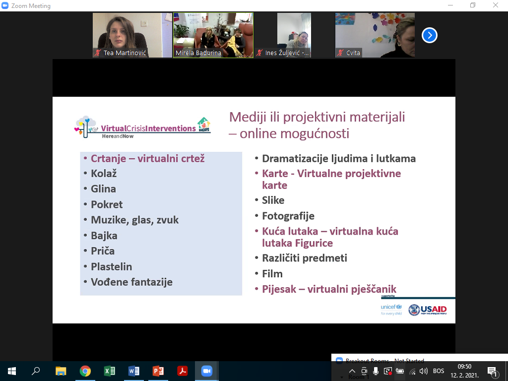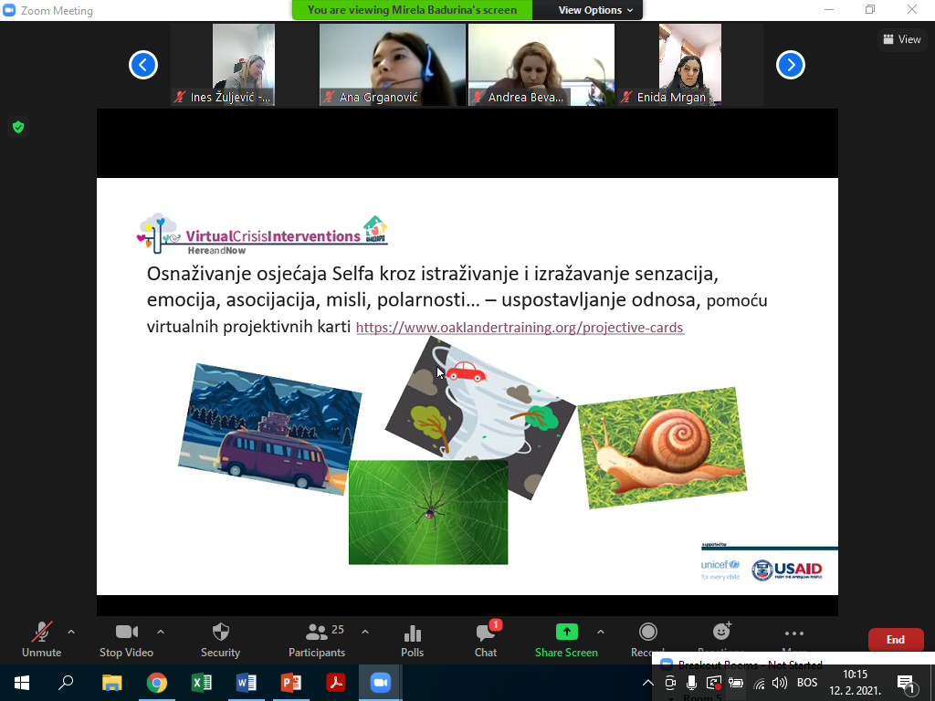 The seventh module of the educational program “Here and Now” is focused on the importance and use of virtual projective techniques-modalities in crisis interventions and treatment. The module included recommendations for effective, targeted and accessible psychosocial virtual support, introducing participants to projective techniques in crisis interventions and treatment of children, adolescents and their parents, with special emphasis on virtual interventions. The module includes a 4-part model with practical tools and virtual projection exercises Oaklander’s Just and Now model, through personal work, working in small groups, and demonstrating the use of virtual projection models with participants. The importance of the four-part Oaklander model and its application in crisis interventions and treatment were discussed.