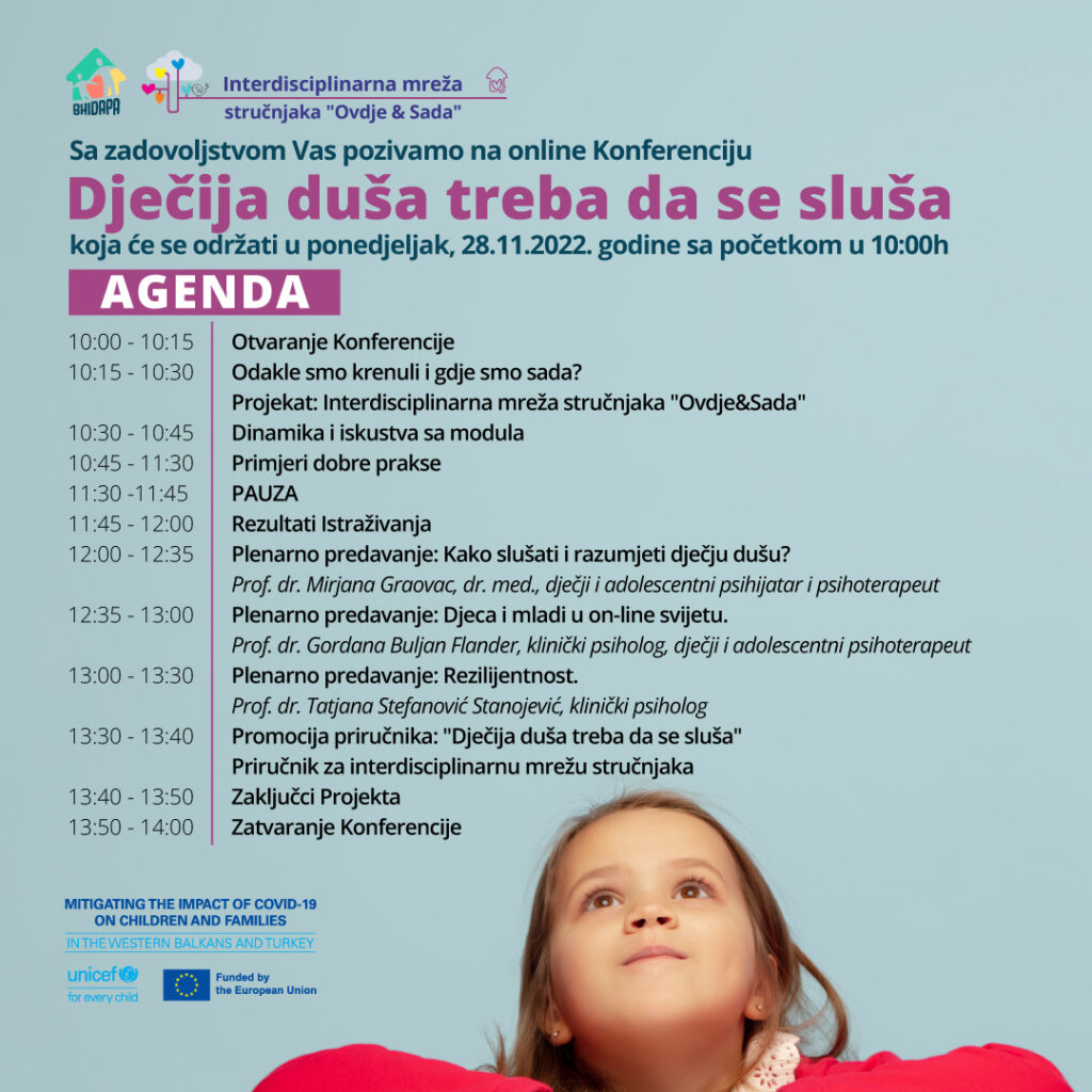 The Project aimed to strengthen the resilience of communities and strengthen the interdisciplinary network of experts through specific activities aimed at providing early interventions and promoting the mental health and emotional well-being of children, adolescents, and their families. The program consists of seven virtual thematic modules lasting 56 hours, divided into three cycles. Under the thematic modules, special emphasis was placed on group processes, experiential exercises, and supervision. A total of 134 experts from the health, social, and educational institutions from the Federation of Bosnia and Herzegovina, Republika Srpska, and Brčko Districts participatedOut of the 3178 indirect beneficiaries of the Project, in relation to the data provided by 65% of the experts involved in the project1860 were children and adolescents, and the rest were parents and primary caregivers. A significant part of the project activities is aimed at researching the determinants of children’s mental health. The sample included 637 children and adolescence aged 3 to 18 years. The final stage of the Project is the manual titled: “A child’s soul needs to be listened to”, which consists of nine (co)authored texts; created with the desire to be additional support in further efforts to preserve the mental health of children and young people. It is intended for experts who did not have the opportunity to participate in the Project (but who, in their daily lives, work and meet with children, young people, and their families), as well as parents and all those who are interested in the mental health and well-being of children.