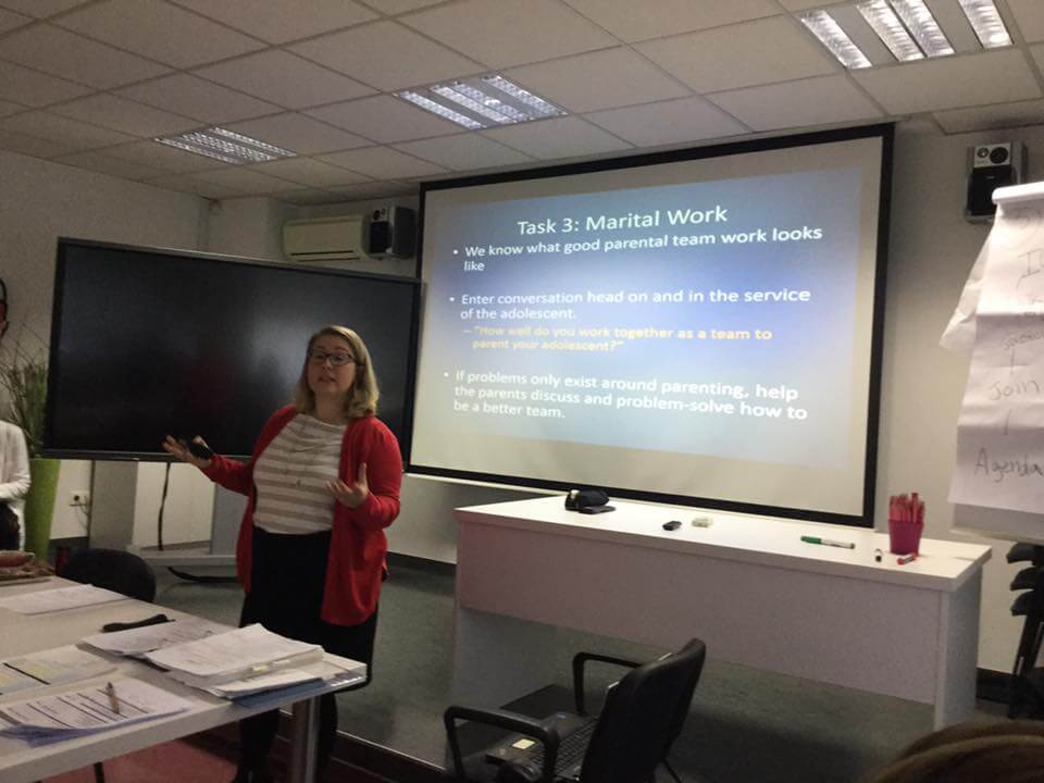 Zadovoljstvo nam je da smo pozvane od Prof. dr. sc. Gordane Buljan Flander, ravnateljice Poliklinike za zaštitu djece i mladih Grada Zagreba, da zajedno sa multidisciplinarnim timom Poliklinike i koleginicama iz Slovenije i Srbije, učimo o obiteljskoj terapiji zasnovanoj na privrženosti u tretmanu adolescenata (ABFT-Attchment Based Family Therapy). Voditeljica edukacije bila je dr. Jody Russon iz SAD-a.