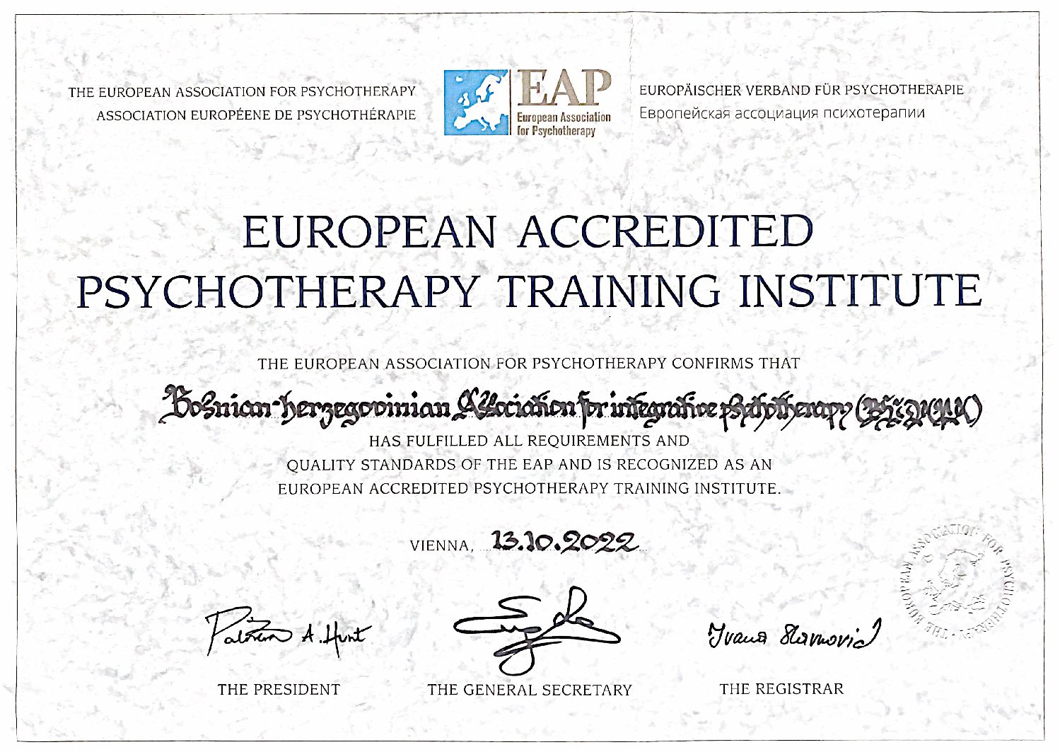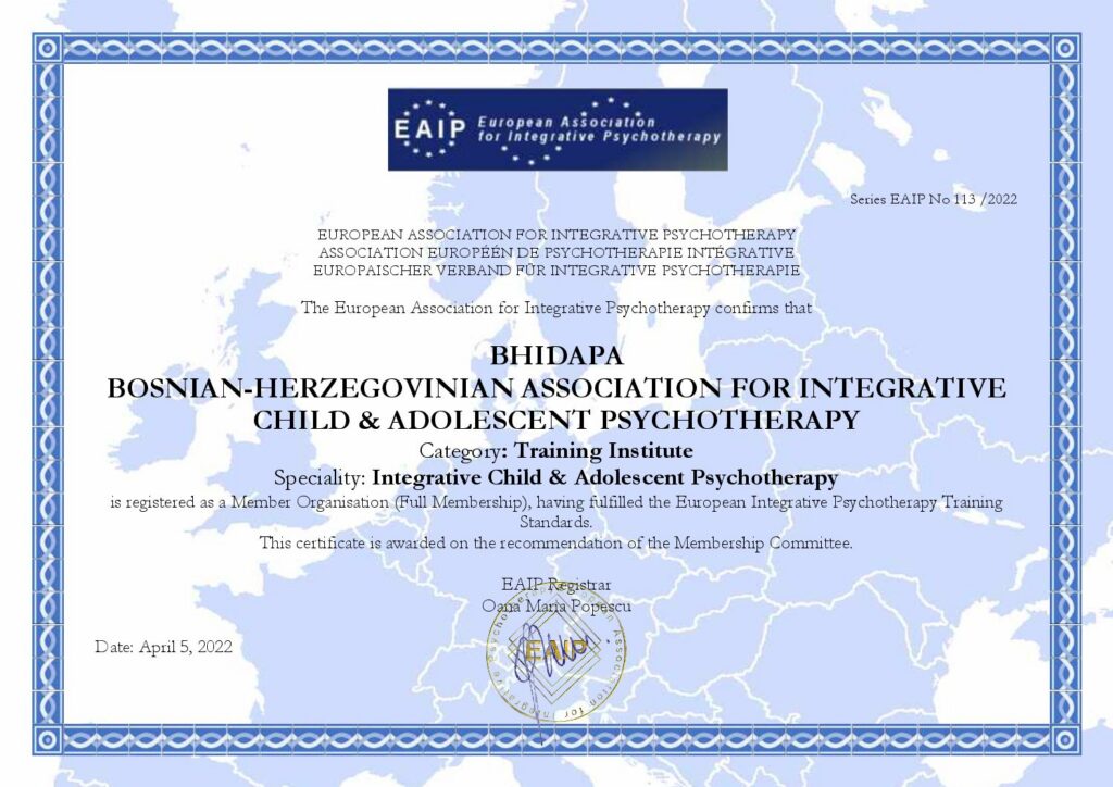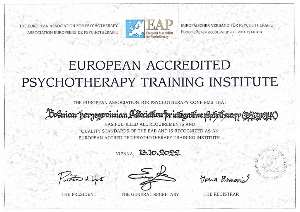 EAPTI-BHIDAPA akreditovan je od EIATSCYP-a, EAIP-a, EAP-a i punopravna je članica SPUuBiH. Svi redovni članovi EAPTI-BHIDAPA-e su članovi i navedenih europskih asocijacija kao i SPUuBiH-a (Saveza psihoterapijskih udruženja u Bosni i Hercegovini).