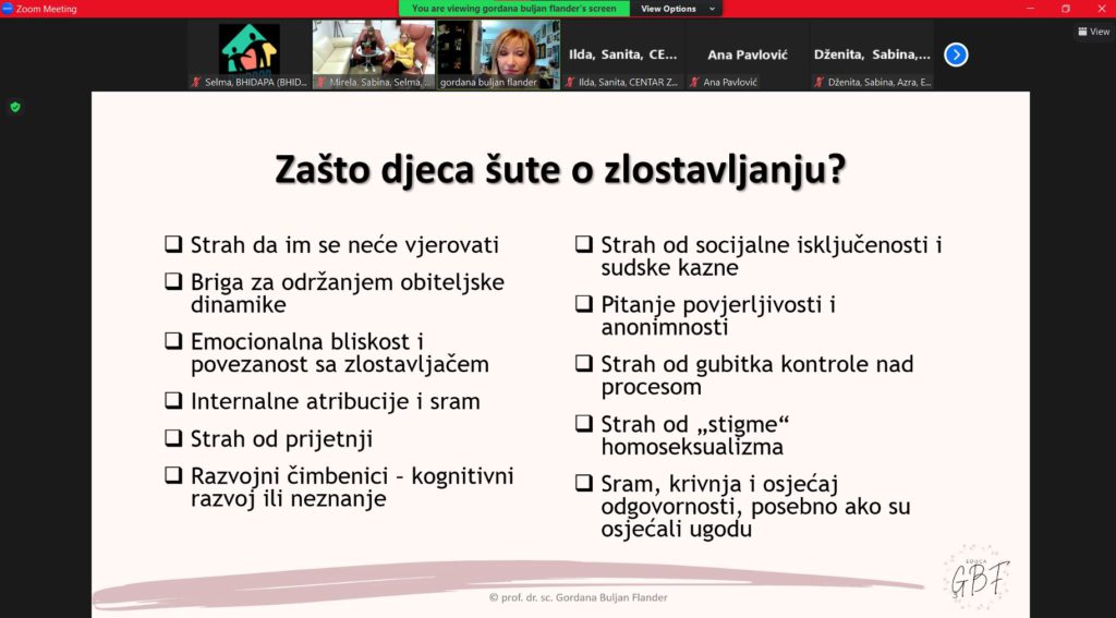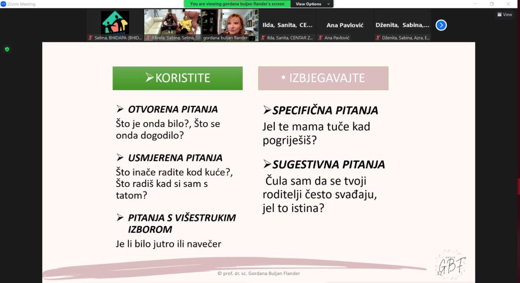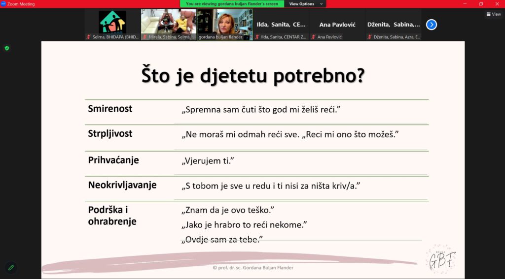 Modul su vodile naše drage, evropski akreditovani treneri – prof. dr. sc. Gordana Buljan Flander, klin. psiholog, psihoterapeut, trener i sudski vještak za zlostavljanu i zanemarenu djecu i dipl. psiholog Sabina Zijadić-Husić, psihoterapeut, trener i supervizor