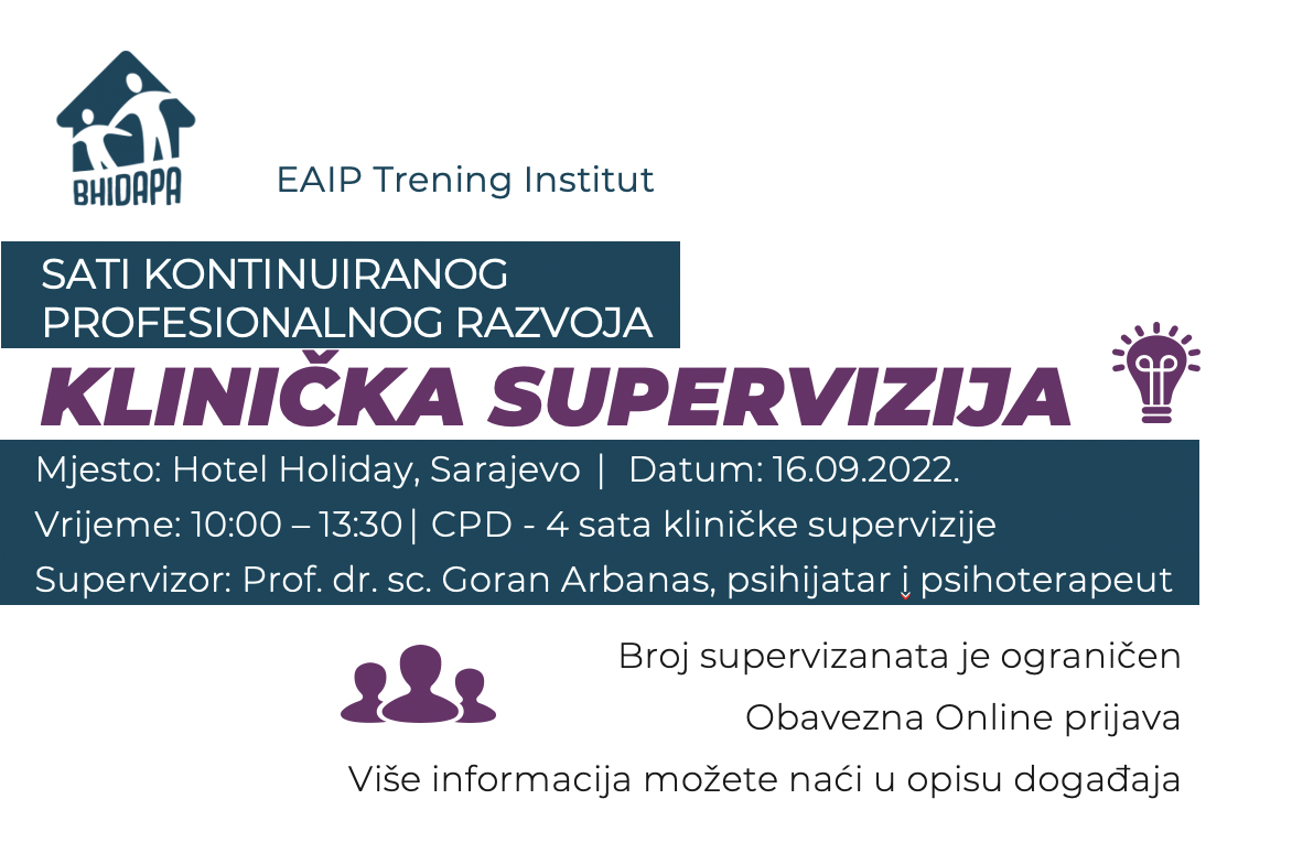 BHIDAPA – EAIP Trening Instit nastavlja slijedi standarde EAP-a. U sklopu obaveznih sati kontinuiranog profesionalnog usavršavanja (CPD) organizuje sate kliničke supervizije za naše edukante i diplomirane psihoterapeute.