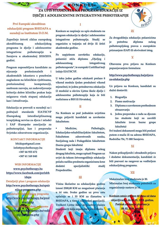 Zbog povećanog interesa za europski akreditovane edukacijske programe u organizaciji BHIDAPA, raspisuju se konkursi za upis kandidata na sljedeće edukacijske programe: