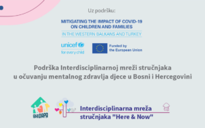 Kako bi doprinijeli zaštiti i smanjenju negativnog utjecaja zdravstvene krize na mentalno zdravlje i dobrobit djece, adolescenata i njihovih roditelja, u maju 2020. godine kreirali smo i implementirali Projekt edukacije/ treninga pod nazivom Virtualne krizne Intervencije „Ovdje i sada“ u suradnji sa UNICEF-om BiH, uz podršku USAID-a i saglasnost nadležnih ministarstava u BiH. Edukacija/trening imao je za cilj osnažiti profesionalce iz centara za mentalno zdravlje, centara za socijalni rad i odgojno-obrazovnih institucija u BiH u primjeni virtualnih/telefonskih kriznih intervencija u radu sa djecom, mladima i obiteljima, tokom pandemije COVID-19.